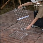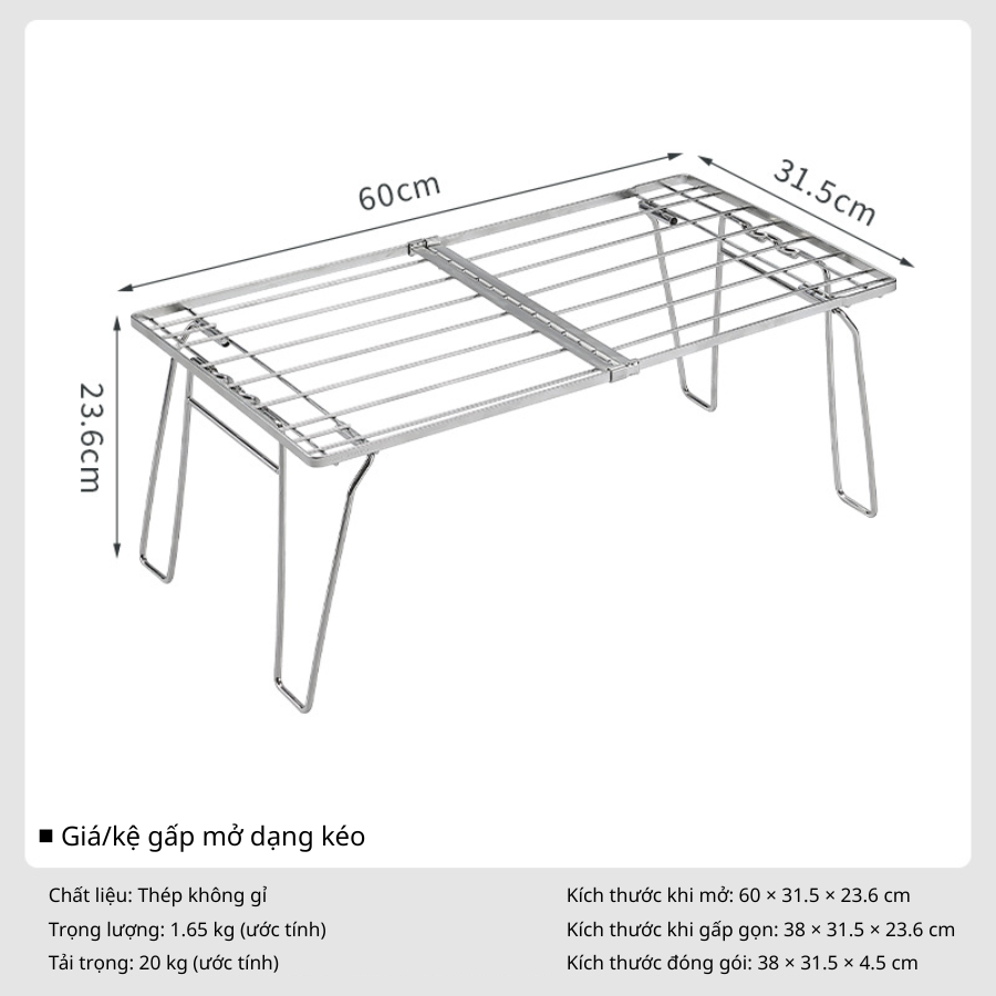 Về chất liệu, kệ được làm từ thép không gỉ cao cấp, cho khả năng chịu lực ổn định lên đến khoảng 20 kg. Kết cấu khung chắc chắn giúp kệ đứng vững trên nhiều bề mặt khác nhau như cỏ, đất, sàn gỗ hay nền đá. Chất liệu inox cũng mang lại ưu điểm vượt trội về độ bền, chống ăn mòn, chịu nhiệt tốt và dễ vệ sinh sau mỗi chuyến đi – đặc biệt phù hợp với môi trường dã ngoại thường xuyên tiếp xúc với nước, nhiệt và bụi bẩn.