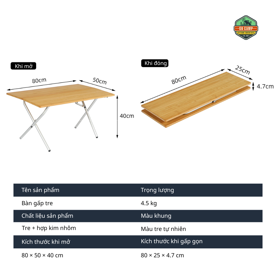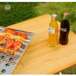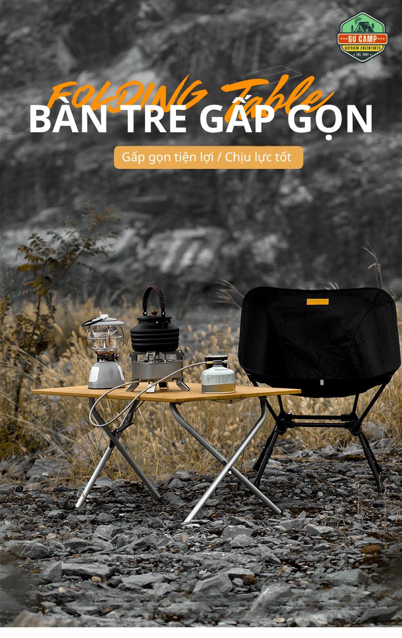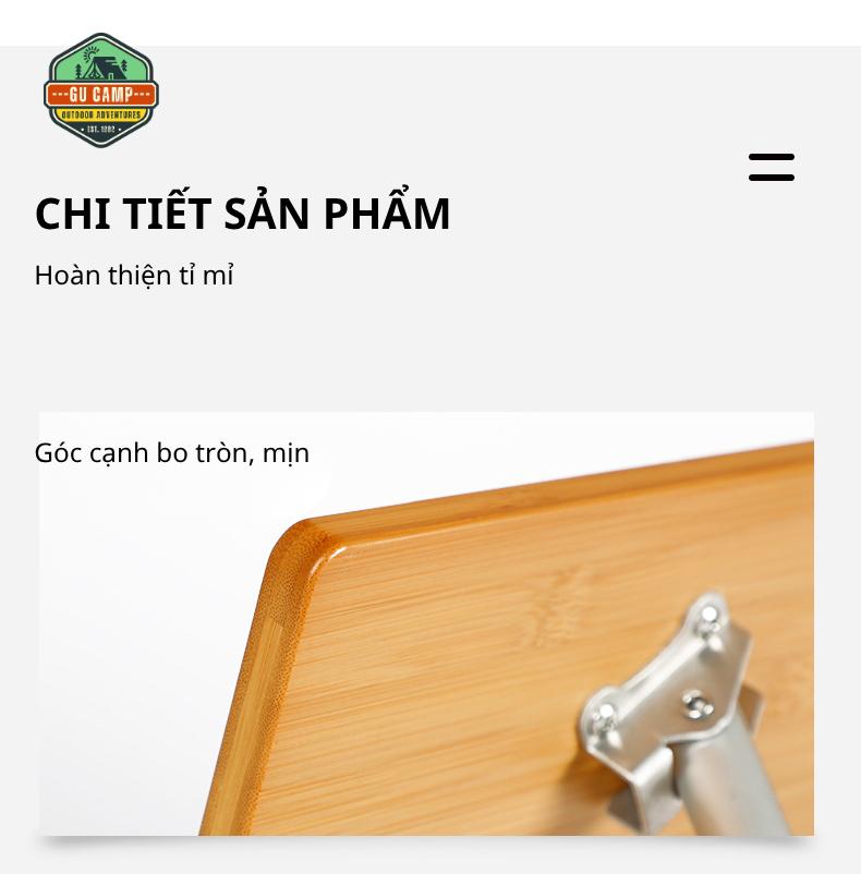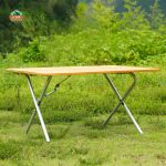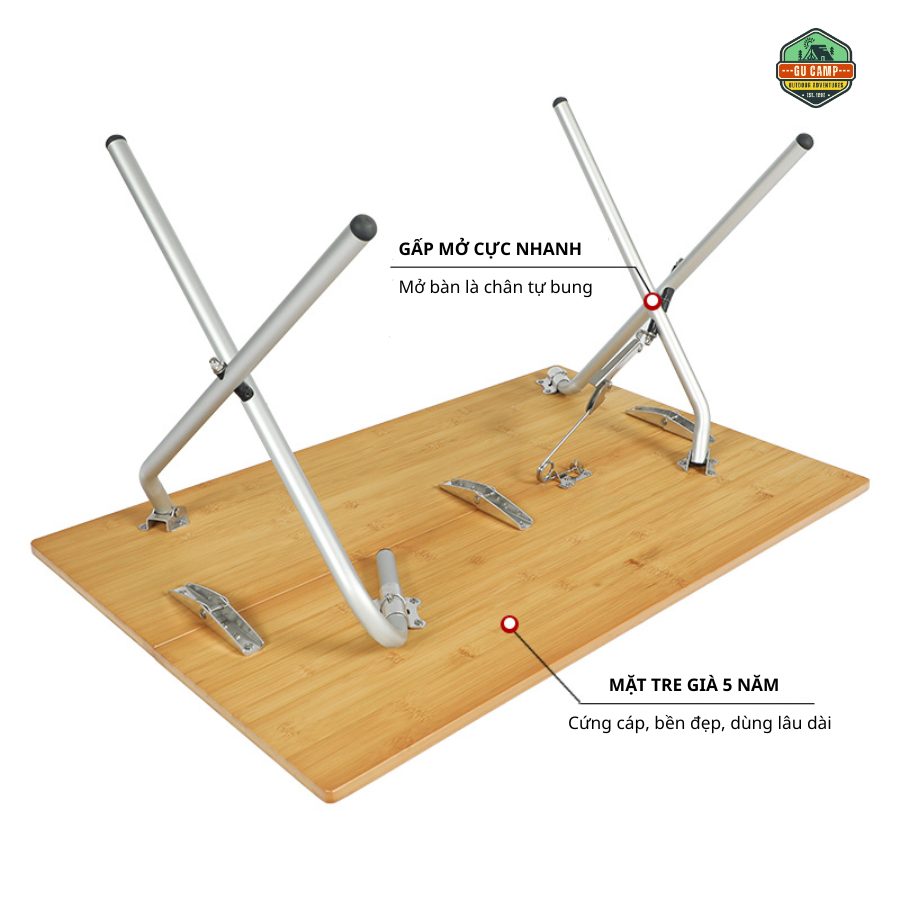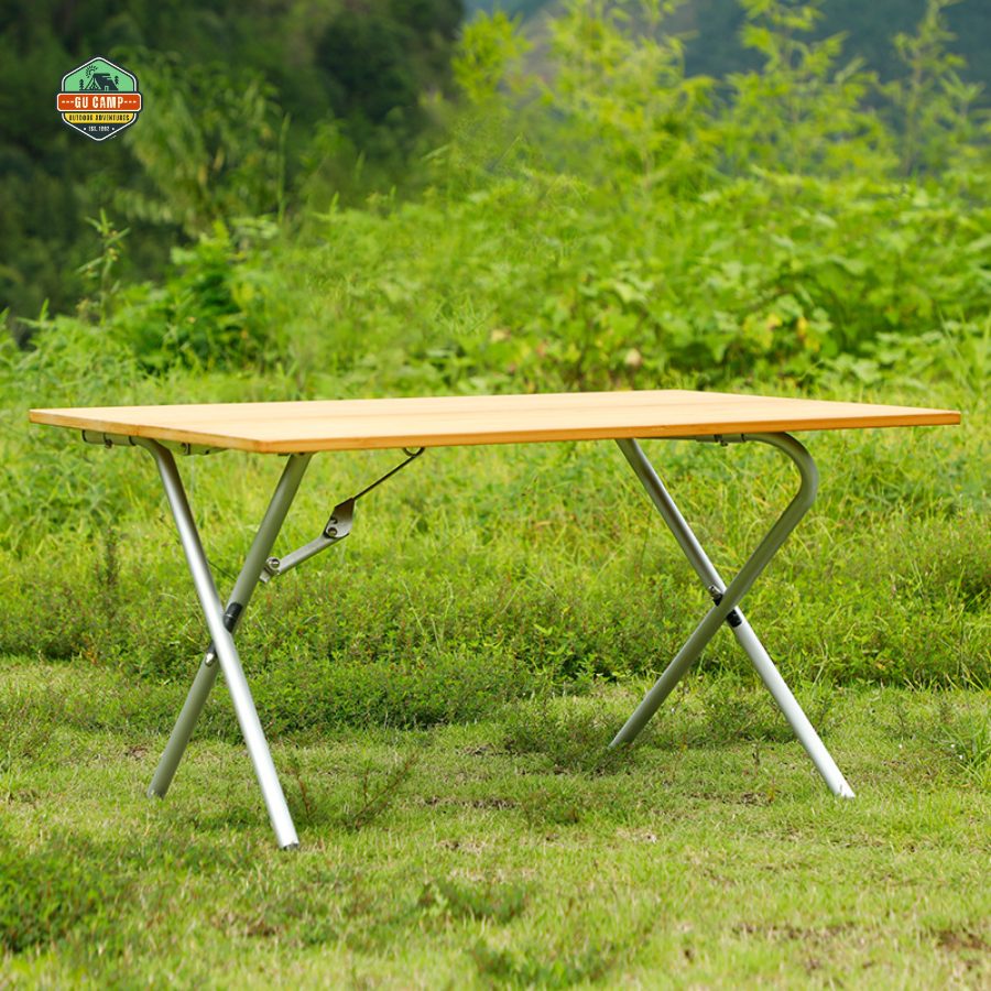 Mặt bàn được làm từ gỗ tre, mang lại sự nhẹ nhàng, cảm giác vừa chắc chắn vừa thẩm mỹ. Bề mặt phẳng, dễ lau chùi, phù hợp để sử dụng làm bàn ăn, bàn pha cà phê hoặc đặt các vật dụng cá nhân khi đi ngoài trời. Dù sử dụng trong điều kiện thiên nhiên như bãi cỏ, đất hoặc cát, bàn vẫn giữ được sự ổn định nhờ thiết kế khung chữ X cân bằng lực tốt.