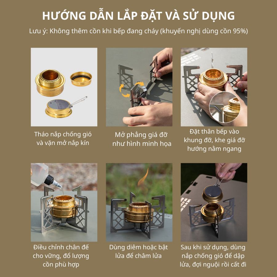 Quy trình lắp đặt bếp cồn dã ngoại rất đơn giản. Người dùng chỉ cần mở phẳng khung đỡ, đặt thân bếp vào đúng vị trí, điều chỉnh chân đế cho vững, đổ lượng cồn phù hợp rồi châm lửa. Sau khi nấu xong, sử dụng nắp dập lửa để tắt bếp, đợi nguội và cất gọn. Thiết kế trực quan giúp cả người mới lẫn người có kinh nghiệm camping đều thao tác nhanh chóng và an toàn.
