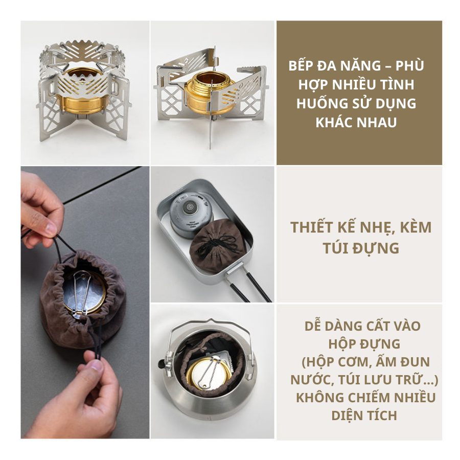 Bếp cồn dã ngoại sở hữu thiết kế khung đỡ có thể gấp gọn, giúp giảm tối đa kích thước khi cất giữ. Khi không sử dụng, bếp dễ dàng xếp gọn vào túi vải đi kèm, hộp cơm, ấm đun nước hoặc túi lưu trữ camping mà không chiếm nhiều diện tích. Với kích thước cất gọn khoảng 9 × 8,5 × 9 cm và trọng lượng chỉ khoảng 200g, sản phẩm đặc biệt phù hợp cho các chuyến trekking, hiking, camping tối giản hoặc du lịch dài ngày.