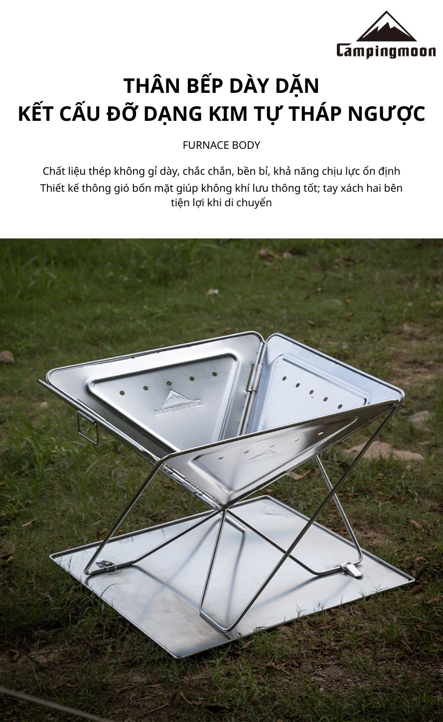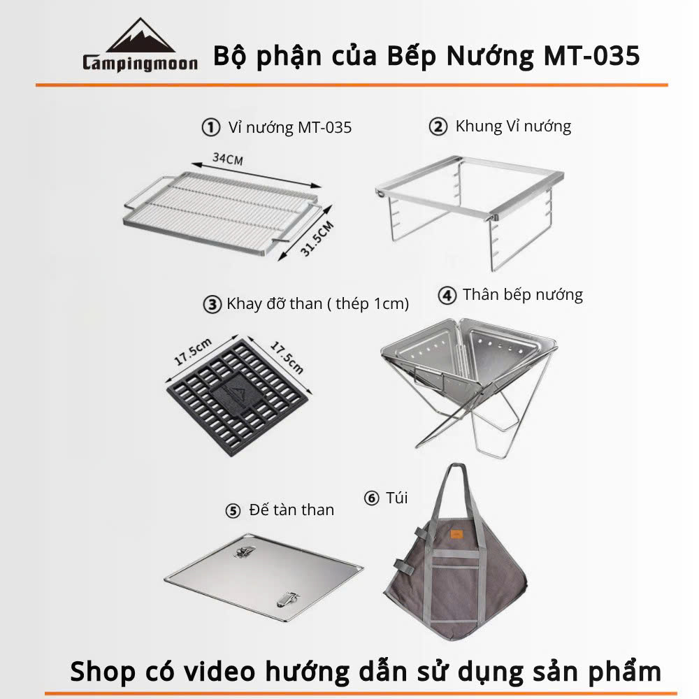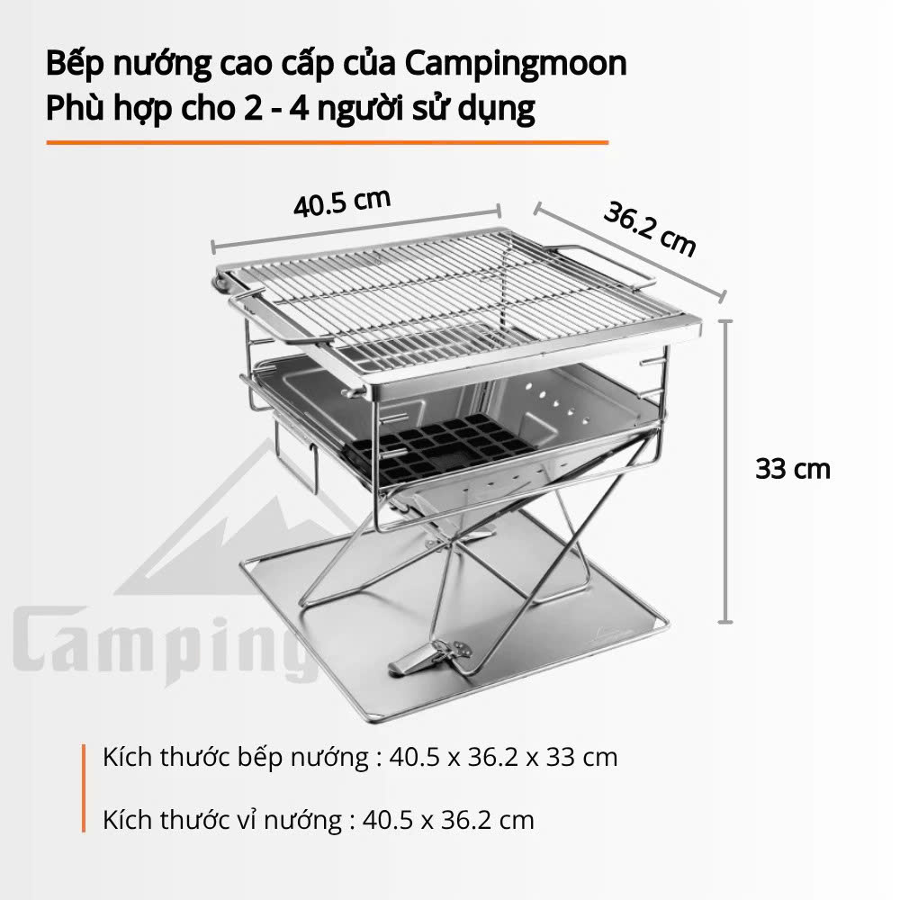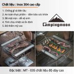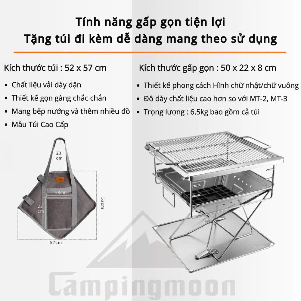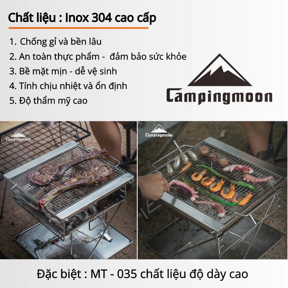 Campingmoon MT-035 là mẫu bếp nướng than gấp gọn được làm từ inox 304 không gỉ, cho độ bền cao, thời gian sử dụng lên đến 5–10 năm. Thiết kế nhỏ gọn, tiện lợi khi sử dụng tại nhà, sân vườn hoặc mang theo trong các chuyến dã ngoại, picnic, camping. Bếp đi kèm túi vải đựng, dễ dàng di chuyển và cất giữ.