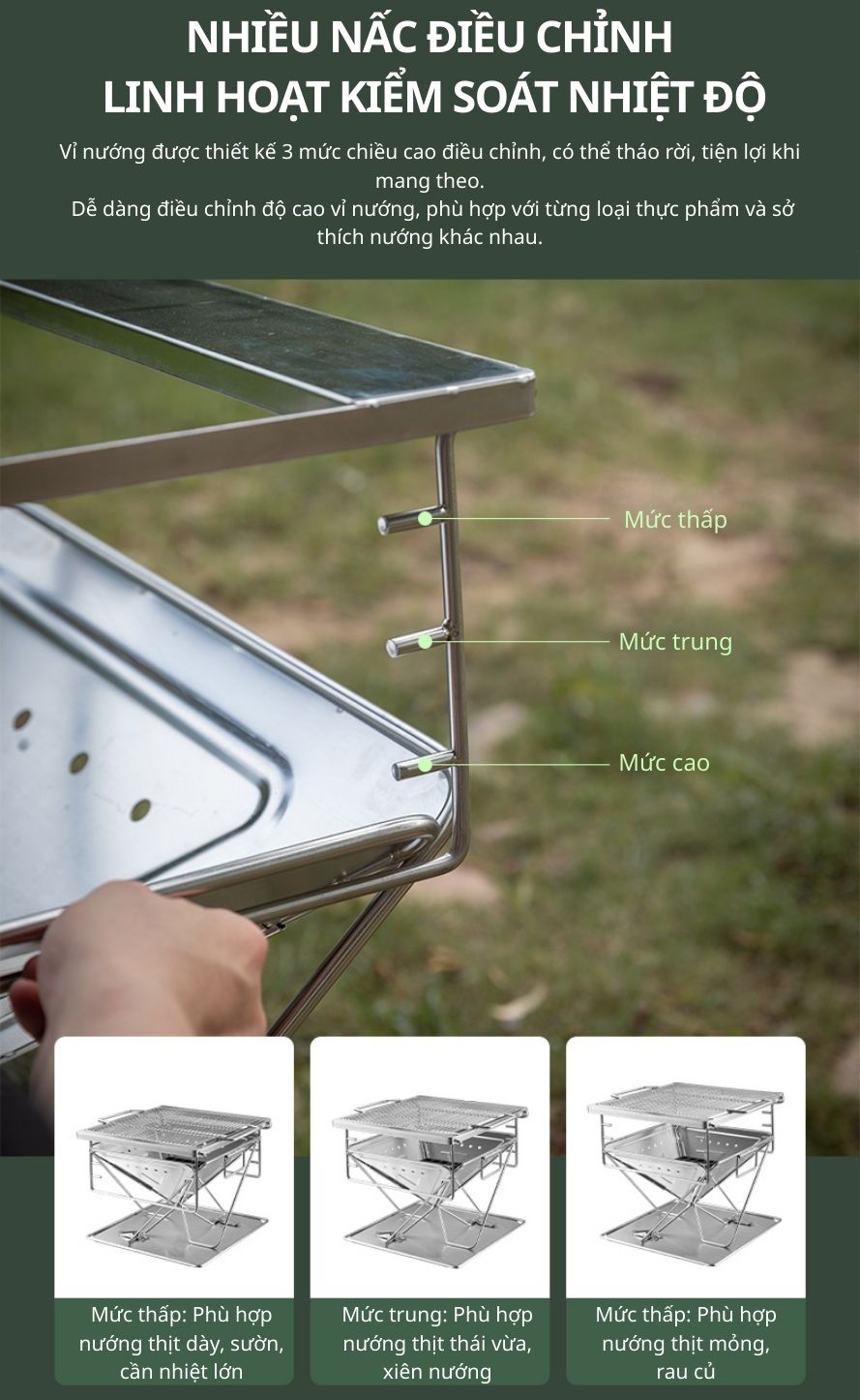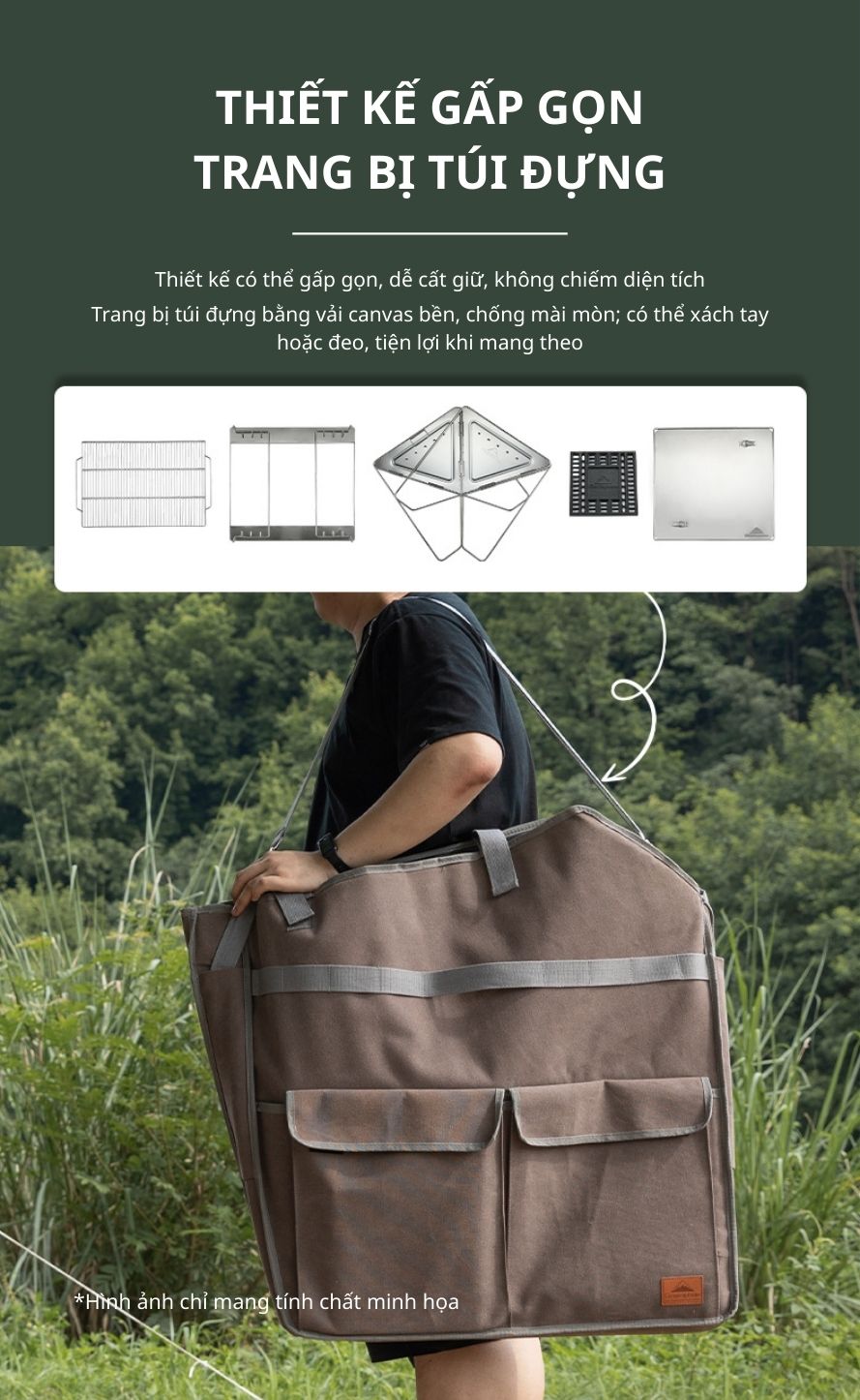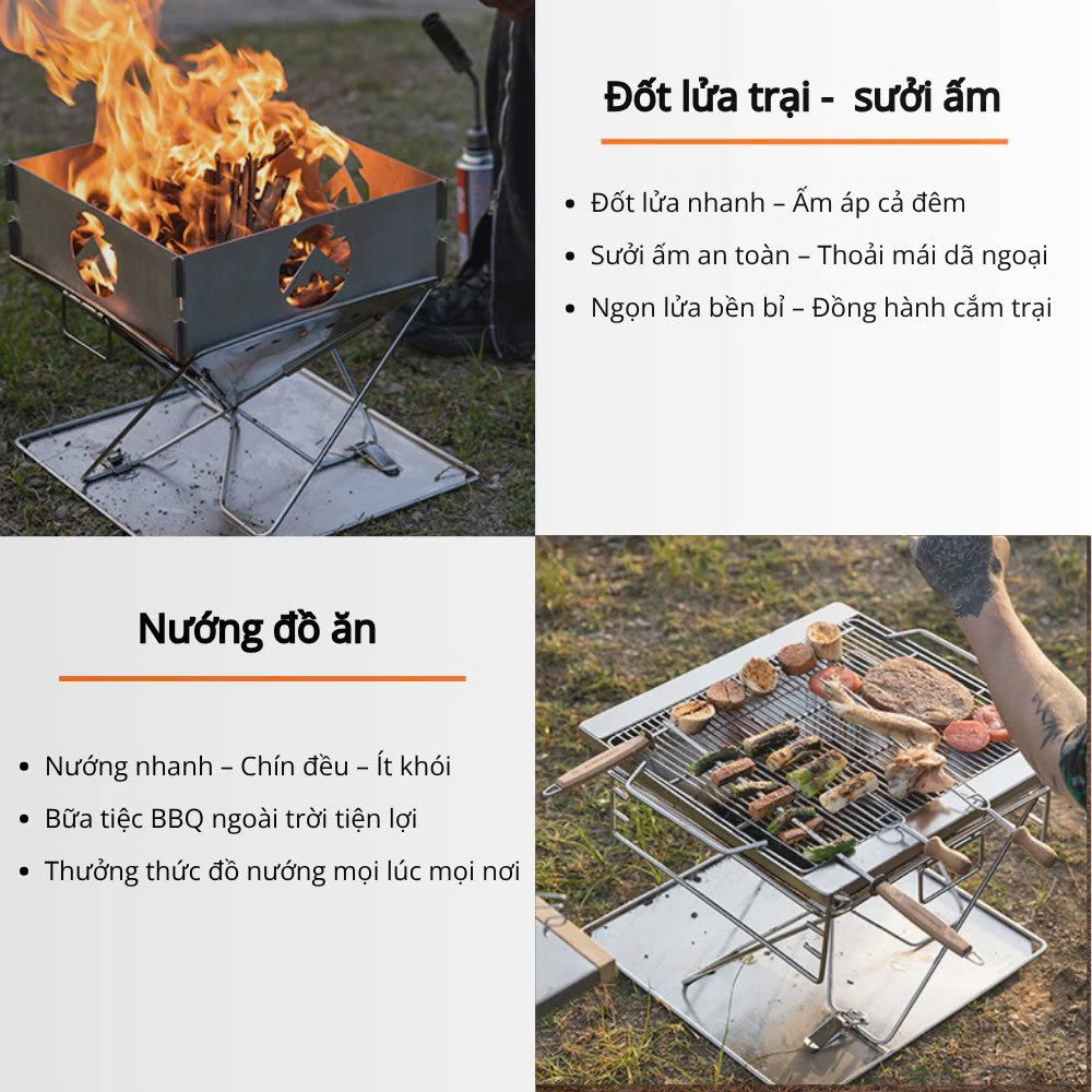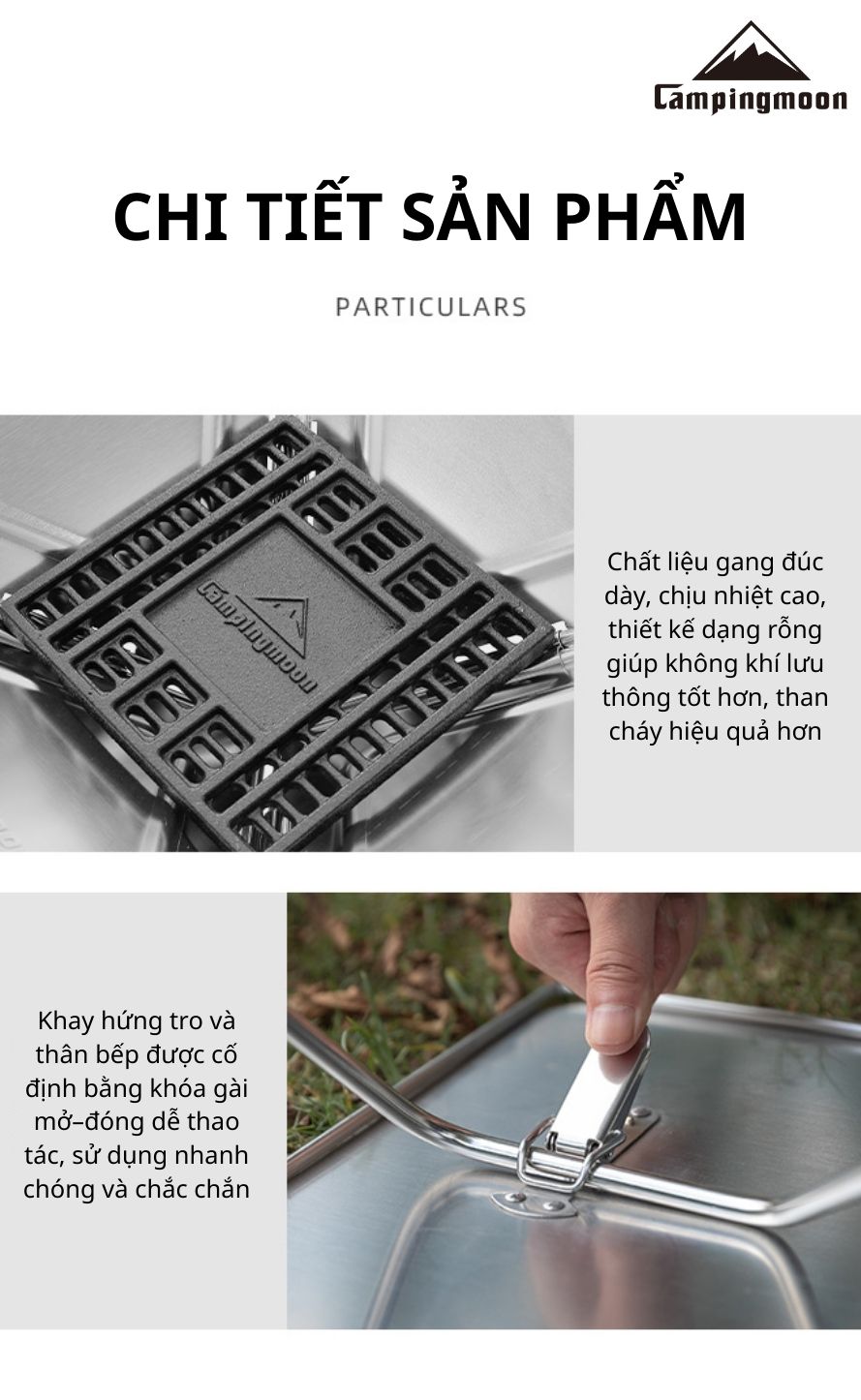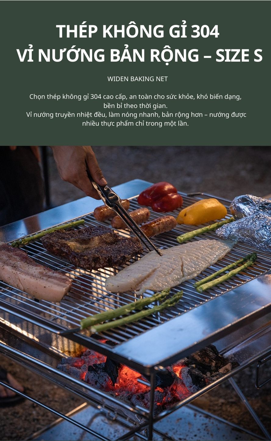 Campingmoon MT-035 là mẫu bếp nướng than gấp gọn được làm từ inox 304 không gỉ, cho độ bền cao, thời gian sử dụng lên đến 5–10 năm. Thiết kế nhỏ gọn, tiện lợi khi sử dụng tại nhà, sân vườn hoặc mang theo trong các chuyến dã ngoại, picnic, camping. Bếp đi kèm túi vải đựng, dễ dàng di chuyển và cất giữ.