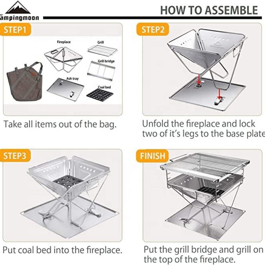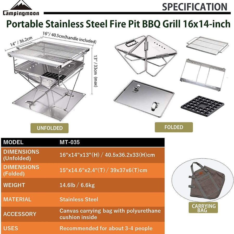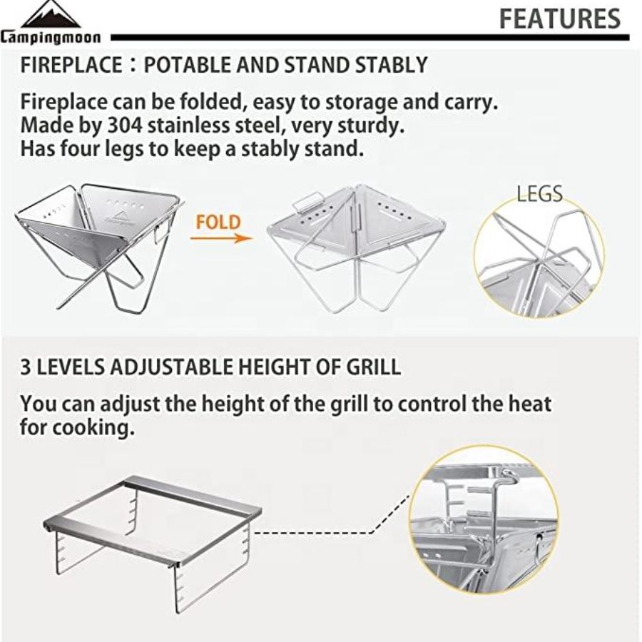 Bếp nướng Campingmoon X-MINI PRO/MT-035/MT-045/MT-055 là chiếc bếp nướng dã ngoại gấp gọn sử dụng nguyên liệu than hoặc củi, vỉ nướng kích thước rộng phù hợp cho nhóm dã ngoại từ 2-10 người tùy kích thước. Bếp nướng Campingmoon được làm từ chất liệu Inox 304 chịu nhiệt cao. Bếp gấp gọn dễ dàng cho việc di chuyển thích hợp các chuyến đi cắm trại, dã ngoại hoặc BBQ sân vườn.