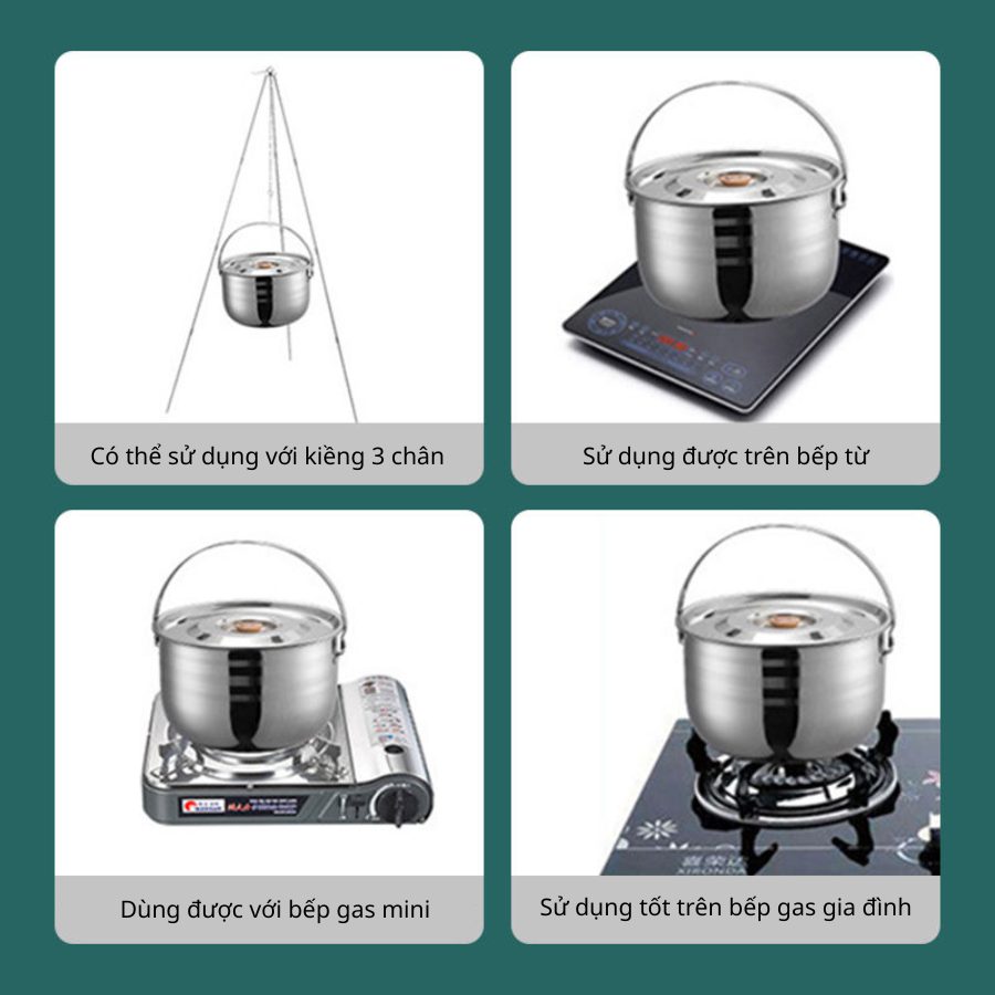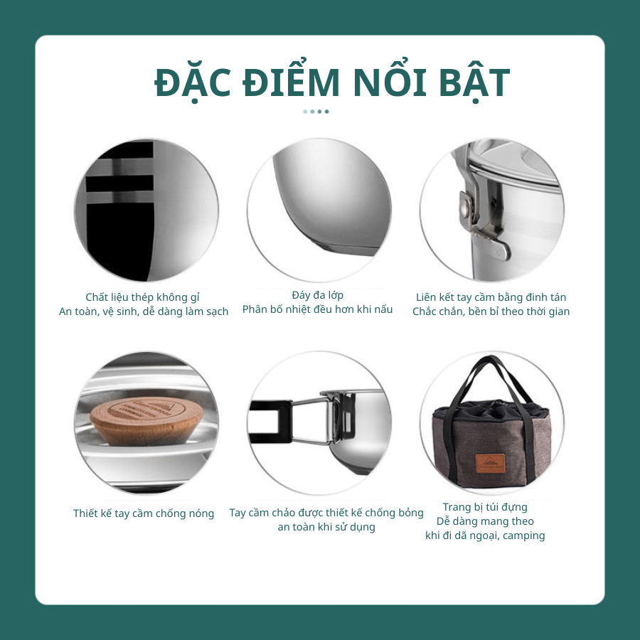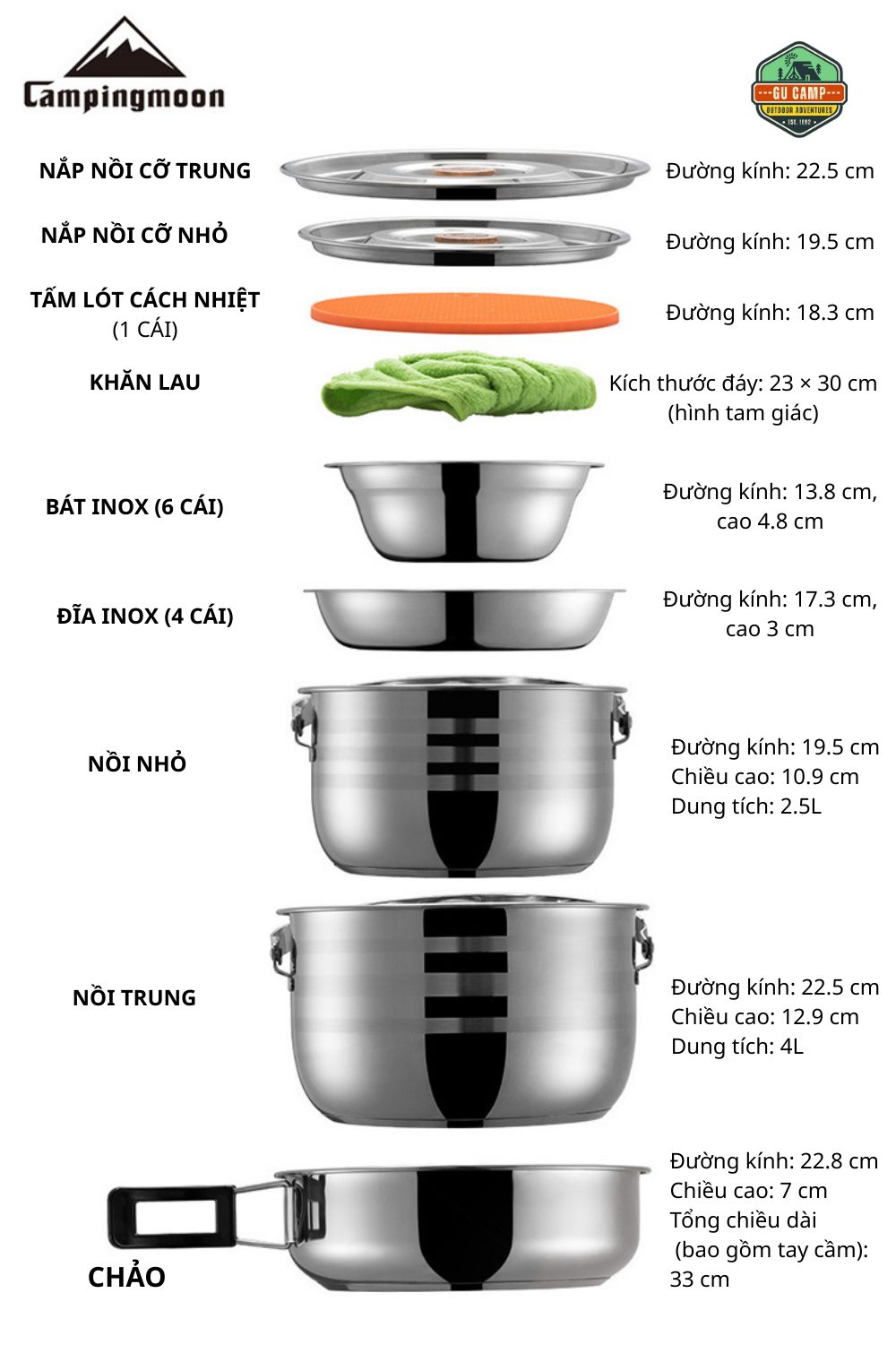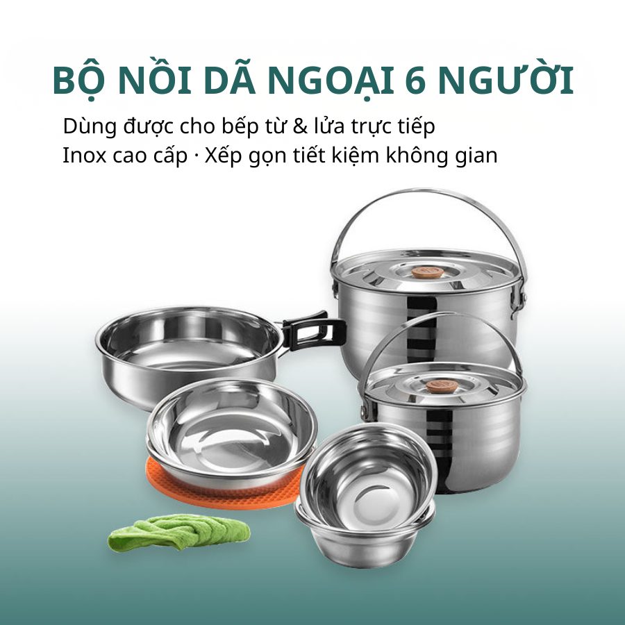| Thành phẩn | – 1 Nồi lớn 4L – 1 Nồi nhỏ 2,5L – 1 Chảo lớn – 1 Tấm lót – 1 Khăn lau – 6 Bát ăn – 4 Đĩa |