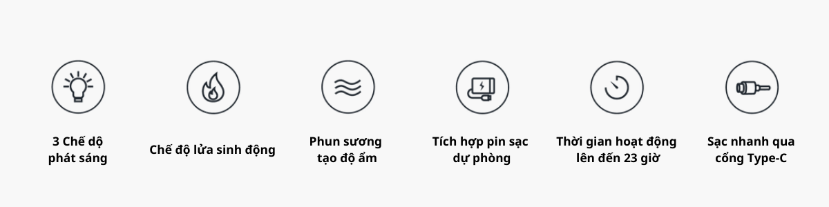 Sở hữu 3 chế độ ánh sáng cảm xúc với hiệu ứng ngọn lửa sống động, chế độ phun sương tạo ẩm, cùng nguồn pin dự phòng khẩn cấp tích hợp, MAX LANTERN là chiếc đèn đa năng hoàn hảo cho các hoạt động ngoài trời hoặc thư giãn hằng ngày.