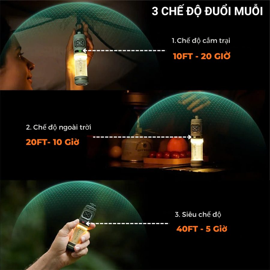 | Phạm vi xua côn trùng | 10 ft / 20 ft / 40 ft (≈ 3 m / 6 m / 12 m) | Chuẩn chống nước | IPX5 |