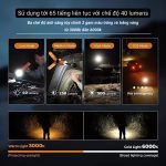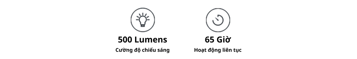 | Chế độ cao | 6.5 giờ + 7 giờ (Low) – 500 lumen | Ánh sáng lạnh | 6500K ±10% |