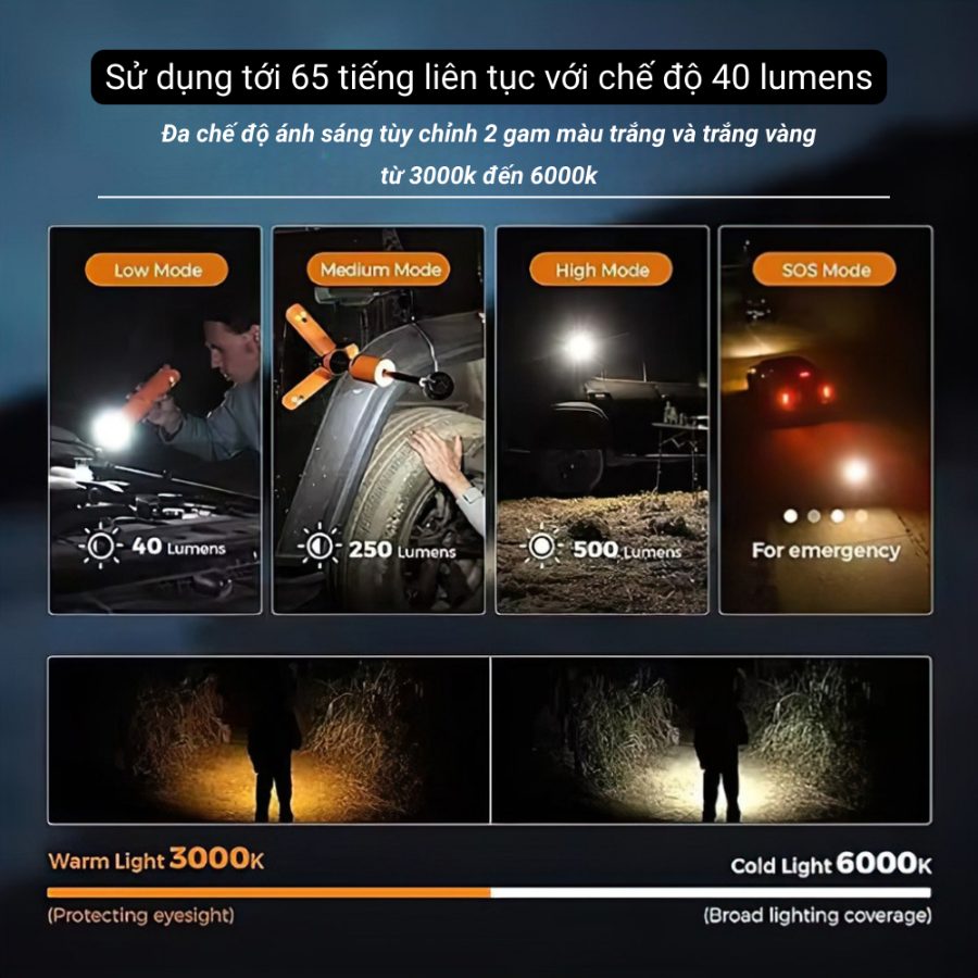 | Chế độ trung bình | 17 giờ + 3 giờ (Low) – 250 lumen | Ánh sáng ấm | 3000K ±10% |