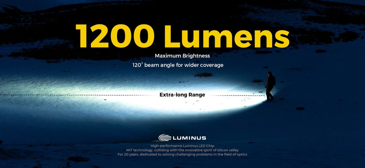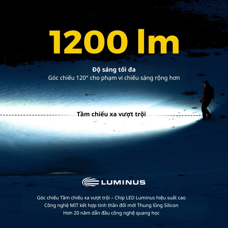 Đèn pin Zero Flashlight đạt độ sáng tối đa lên đến 1200 lumens, sử dụng chip LED LUMINUS hiệu suất cao, cho khả năng chiếu sáng mạnh mẽ và ổn định. Góc chiếu rộng 120° giúp bao phủ ánh sáng tốt hơn, dễ dàng quan sát trong nhiều điều kiện khác nhau.