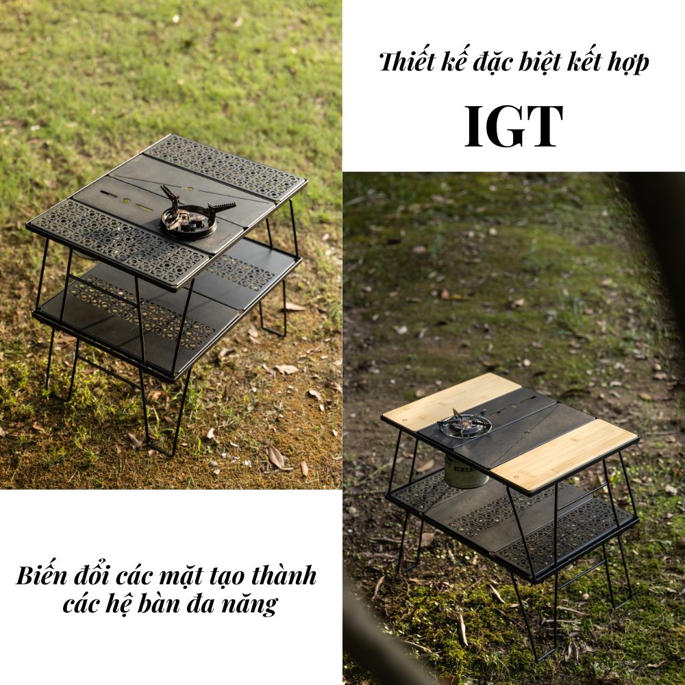 Bàn gấp camping 2 tầng được thiết kế tối ưu cho nhu cầu nấu ăn và sinh hoạt ngoài trời. Điểm nổi bật của sản phẩm là khoảng trống trung tâm chuẩn 1 Unit IGT, cho phép lắp đặt bếp hoặc module hệ IGT một cách vừa vặn và chắc chắn.