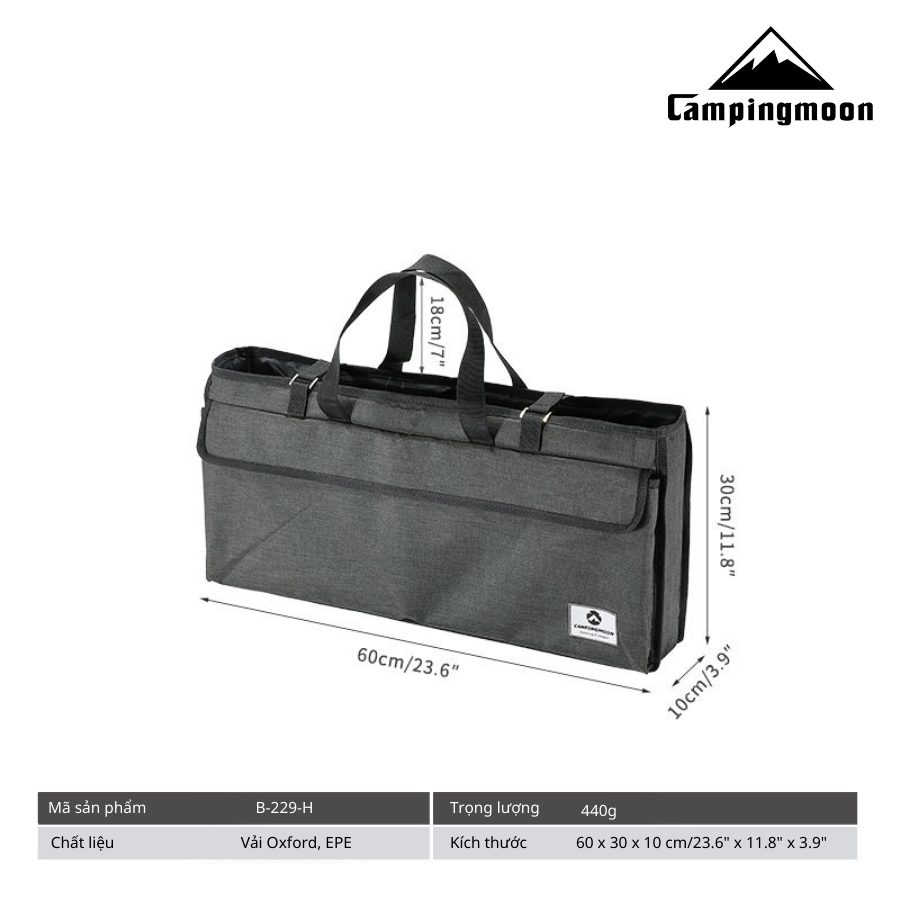 Nhờ thiết kế thực dụng, bền bỉ và đồng bộ với hệ sản phẩm Campingmoon, túi đựng giá/kệ dã ngoại Campingmoon B-229-H là lựa chọn lý tưởng cho người yêu camping, overland, BBQ ngoài trời hoặc dã ngoại gia đình. Đây không chỉ là một chiếc túi đựng, mà còn là giải pháp giúp bảo vệ thiết bị, nâng cao trải nghiệm sử dụng và tối ưu sự chuyên nghiệp trong mỗi chuyến đi.